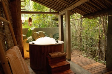Cada Bangalô é uma obra-prima de design, com sua estética singular e detalhes meticulosamente selecionados para garantir uma experiência verdadeiramente única. Desfrute de piscinas privativas aquecidas ou relaxe em banheiras espaçosas, onde a privacidade é uma prioridade, permitindo momentos preciosos de reconexão consigo mesmo e com a natureza, cheio de palmeiras babaçu é uma experiência agradável.