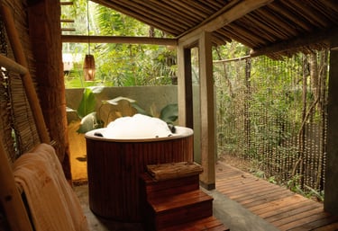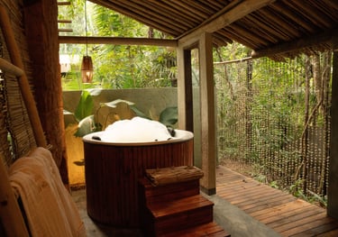 Cada Bangalô é uma obra-prima de design, com sua estética singular e detalhes meticulosamente selecionados para garantir uma experiência verdadeiramente única. Desfrute de piscinas privativas aquecidas ou relaxe em banheiras espaçosas, onde a privacidade é uma prioridade, permitindo momentos preciosos de reconexão consigo mesmo e com a natureza, cheio de palmeiras babaçu é uma experiência agradável.