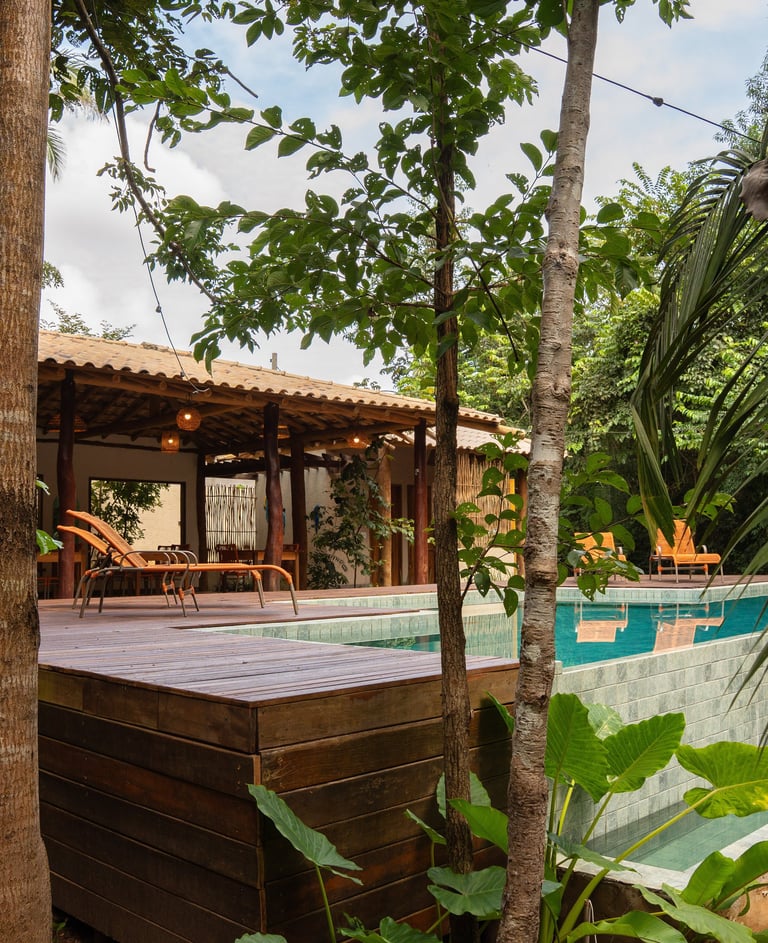 Composta por quatro bangalôs independentes — Babaçu, Terra, Árvore e Bambu —, cada um foi pensado nos mínimos detalhes por profissionais de arquitetura e design para unir o rústico ao contemporâneo em uma proposta eco chic. O resultado é uma estética refinada, com materiais naturais como madeiras nobres e cimento queimado, que dialogam harmoniosamente com o entorno de vegetação nativa e jardins com plantas do cerrado.