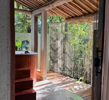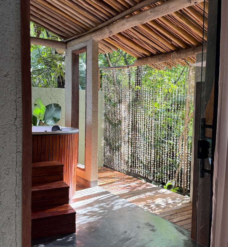 Rodeado por imponentes babaçus e com uma vista deslumbrante do verde nativo, este bangalô oferece uma ampla varanda com uma confortável rede king e um ofurô privativo. Equipado com cama queen-size, TV, ar-condicionado, frigobar, amplo banheiro e secador de cabelo, proporciona o equilíbrio perfeito entre conforto e natureza